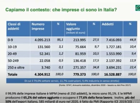 Per capire il perchè è bene ricordare che a fronte di circa 60.000.000 di abitanti in Italia ci sono 4.304.912 imprese attive (fonte: Istat, Dicembre 2020) e che il 95,1% delle imprese ha meno di 10 addetti (PMI- le cosidette micro imprese) che comunque contano il 27,5% del valore aggiunto dell’intero paese e soprattutto circa il 44,9% di occupazione del settore privato. Salendo poi di un gradino, vediamo che le imprese da 10 a 19 addetti sono 131.560, quelle da 20 a 49 addetti sono 52.341, quelle da 50 a 249 addetti sono 22.058, mentre le grandi imprese, cioè quelle al di sopra di 250 addetti, sono solo 3.740.